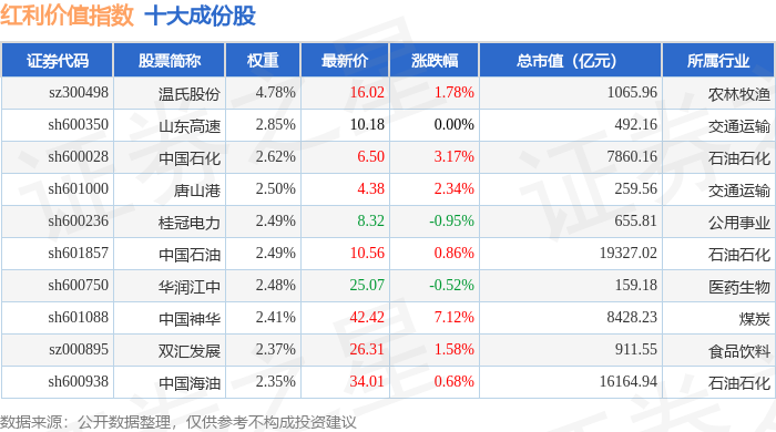 红利价值(980103)指数十大成份股详情如下: