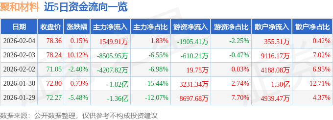 证券之星消息,截至2026年2月4日收盘,聚和材料(688503)报收于78.36元,上涨0.15%,换手率5.42%,成交量10.9万手,成交额8.48亿元。