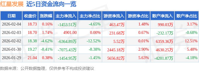 证券之星消息,截至2026年2月4日收盘,红星发展(600367)报收于18.73元,上涨0.16%,换手率5.18%,成交量16.68万手,成交额3.12亿元。