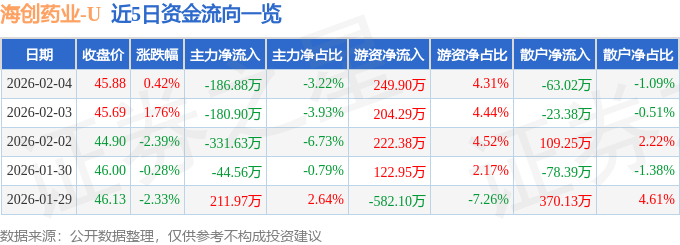 证券之星消息,截至2026年2月4日收盘,海创药业(688302)报收于45.88元,上涨0.42%,换手率1.27%,成交量1.26万手,成交额5799.55万元。