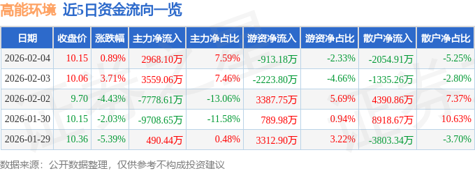 证券之星消息,截至2026年2月4日收盘,高能环境(603588)报收于10.15元,上涨0.89%,换手率2.53%,成交量38.56万手,成交额3.91亿元。