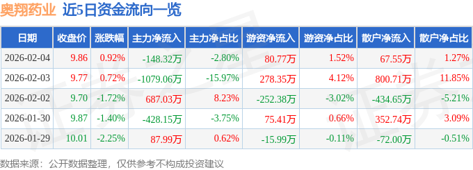 证券之星消息,截至2026年2月4日收盘,奥翔药业(603229)报收于9.86元,上涨0.92%,换手率0.65%,成交量5.42万手,成交额5306.21万元。