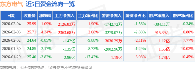 证券之星消息,截至2026年2月4日收盘,东方电气(600875)报收于25.99元,上涨1.09%,换手率1.9%,成交量43.05万手,成交额11.19亿元。