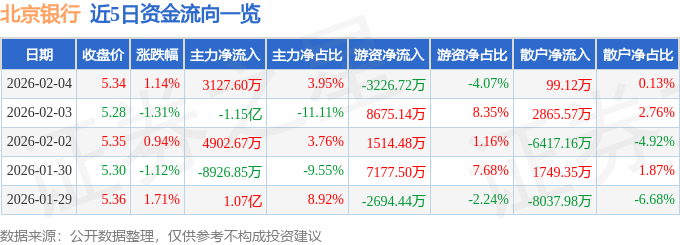证券之星消息,截至2026年2月4日收盘,北京银行(601169)报收于5.34元,上涨1.14%,换手率0.7%,成交量148.68万手,成交额7.92亿元。