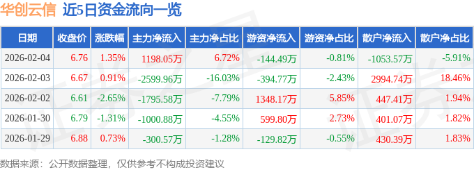证券之星消息,截至2026年2月4日收盘,华创云信(600155)报收于6.76元,上涨1.35%,换手率1.2%,成交量26.63万手,成交额1.78亿元。