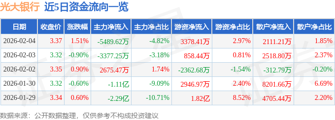 证券之星消息,截至2026年2月4日收盘,光大银行(601818)报收于3.37元,上涨1.51%,换手率0.73%,成交量339.14万手,成交额11.39亿元。
