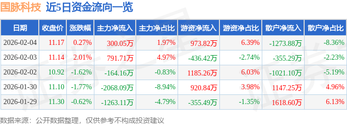 证券之星消息,截至2026年2月4日收盘,国脉科技(002093)报收于11.17元,上涨0.27%,换手率1.36%,成交量13.7万手,成交额1.52亿元。