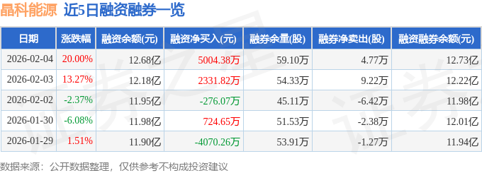 晶科能源融资融券信息显示,融资方面,当日融资买入4.46亿元,融资偿还3.96亿元,融资净买入5004.38万元。融券方面,融券卖出18.16万股,融券偿还13.38万股,融券余量59.1万股,融券余额496.45万元。融资融券余额12.73亿元。