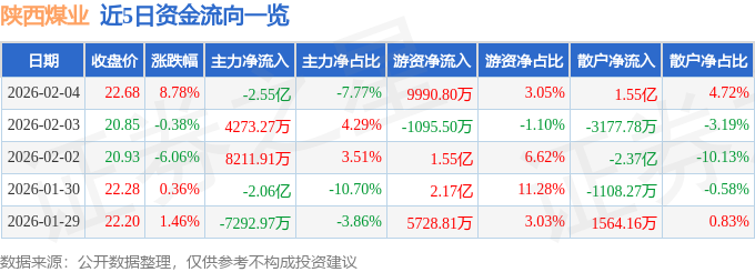 证券之星消息,截至2026年2月4日收盘,陕西煤业(601225)报收于22.68元,上涨8.78%,换手率1.53%,成交量147.94万手,成交额32.8亿元。