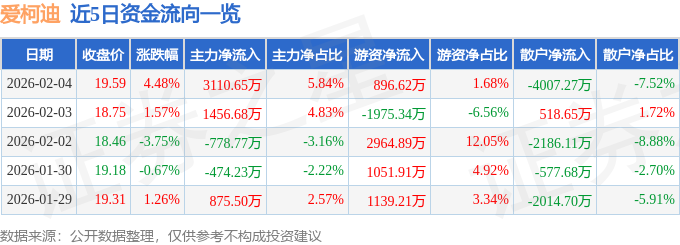 证券之星消息,截至2026年2月4日收盘,爱柯迪(600933)报收于19.59元,上涨4.48%,换手率2.82%,成交量27.59万手,成交额5.33亿元。