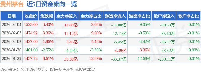证券之星消息,截至2026年2月4日收盘,贵州茅台(600519)报收于1525.0元,上涨3.4%,换手率0.87%,成交量10.91万手,成交额164.44亿元。