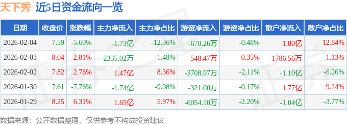 证券之星消息,截至2026年2月4日收盘,天下秀(600556)报收于7.59元,下跌5.6%,换手率10.22%,成交量184.78万手,成交额14.04亿元。