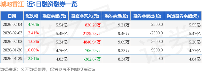 证券之星消息,截至2026年2月4日收盘,城地香江(603887)报收于15.4元,下跌4.7%,换手率6.11%,成交量36.35万手,成交额5.61亿元。