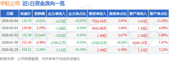 证券之星消息,截至2026年2月4日收盘,华虹公司(688347)报收于133.79元,下跌4.41%,换手率4.78%,成交量19.48万手,成交额26.01亿元。
