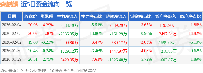 证券之星消息,截至2026年2月4日收盘,森麒麟(002984)报收于20.93元,上涨4.29%,换手率4.3%,成交量30.72万手,成交额6.42亿元。