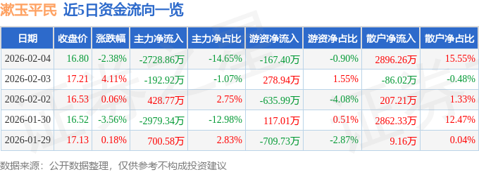 证券之星消息,截至2026年2月4日收盘,漱玉平民(301017)报收于16.8元,下跌2.38%,换手率4.5%,成交量10.97万手,成交额1.86亿元。