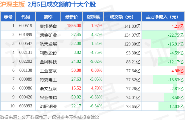 当日沪深主板成交额前10大个股中3只个股收涨,平均涨幅2.55%,其中贵州茅台(600519)以成交额141.83亿元排第一。从主力资金流入看,成交额前10大个股中有2只个股呈现主力资金净流入。