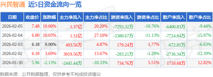 证券之星消息,兴民智通2月5日涨停收盘,收盘价7.48元。该股于9点49分涨停,未打开涨停,截止收盘封单资金为1.12亿元,占其流通市值2.41%。