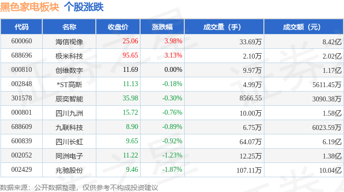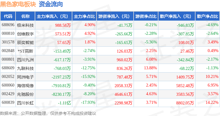 从资金流向上来看,当日黑色家电板块主力资金净流出2.94亿元,游资资金净流入1.12亿元,散户资金净流入1.81亿元。黑色家电板块个股资金流向见下表: