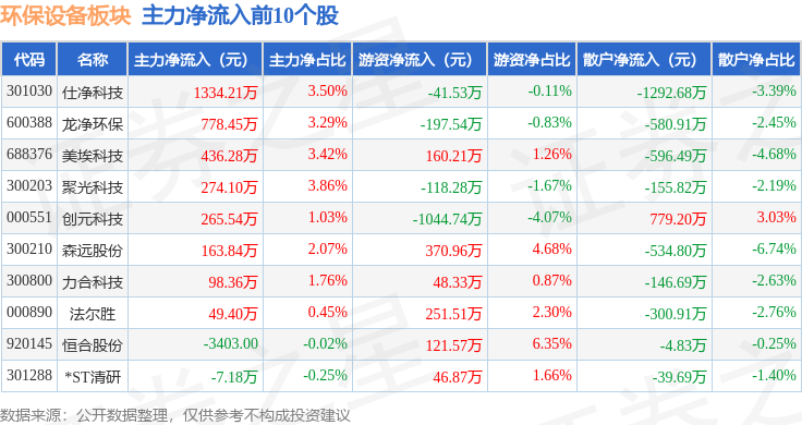 从资金流向上来看,当日环保设备板块主力资金净流出1.73亿元,游资资金净流入1394.32万元,散户资金净流入1.59亿元。环保设备板块个股资金流向见下表: