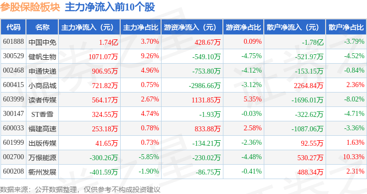 从资金流向上来看,当日参股保险板块主力资金净流出8.57亿元,游资资金净流入2.77亿元,散户资金净流入5.8亿元。参股保险板块个股资金流向见下表:
