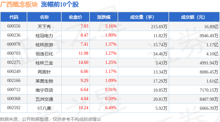 从资金流向上来看,当日广西概念板块主力资金净流出3823.53万元,游资资金净流出1.26亿元,散户资金净流入1.64亿元。广西概念板块个股资金流向见下表: