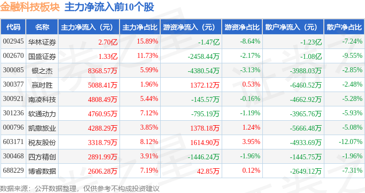 从资金流向上来看,当日金融科技板块主力资金净流出14.35亿元,游资资金净流入5.9亿元,散户资金净流入8.45亿元。金融科技板块个股资金流向见下表: