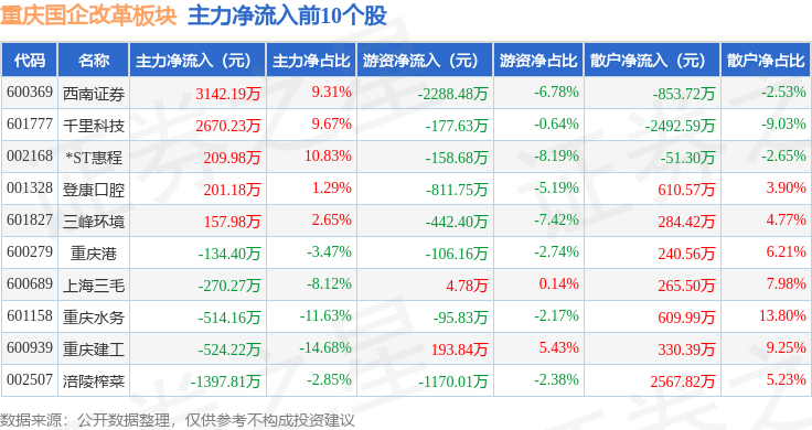 从资金流向上来看,当日重庆国企改革板块主力资金净流出2585.5万元,游资资金净流出5172.23万元,散户资金净流入7757.73万元。重庆国企改革板块个股资金流向见下表: