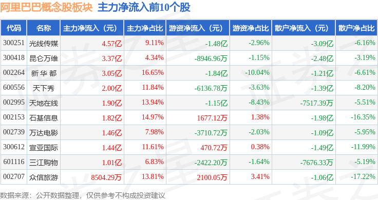 从资金流向上来看,当日阿里巴巴概念股板块主力资金净流出57.82亿元,游资资金净流入11.12亿元,散户资金净流入46.71亿元。阿里巴巴概念股板块个股资金流向见下表: