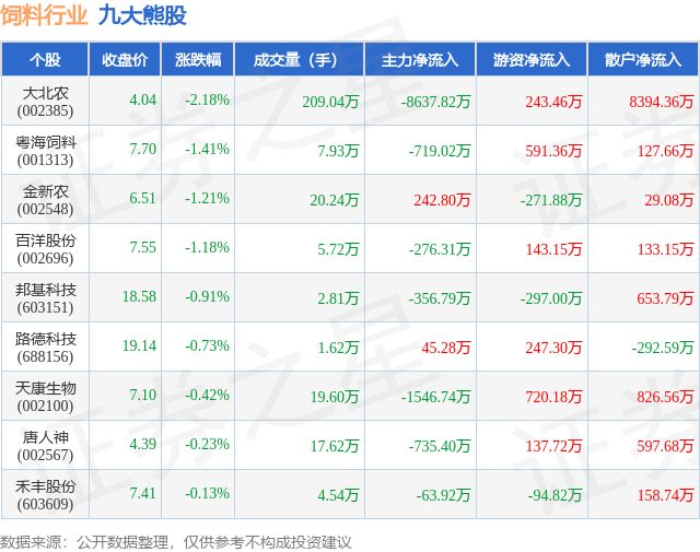 个股表现方面,饲料行业当日领跌股为大北农(002385),该股当日报收4.04,下跌2.18%,成交量209.04万,主力资金净流出8637.82万元。粤海饲料(001313)以下跌1.41%紧随其后,该股当日成交量7.93万,主力资金净流出719.02万元。除此之外,金新农(002548)、百洋股份(002696)、邦基科技(603151)均进入当日熊股之列。具体个股列表见下表: