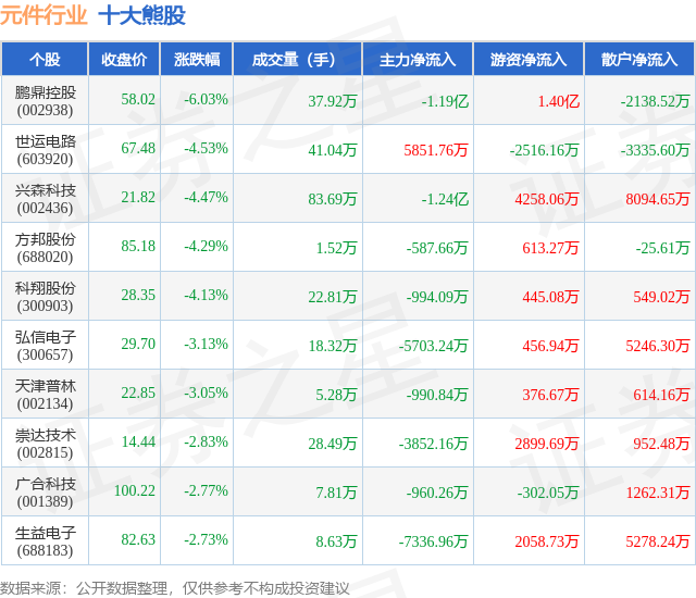 个股表现方面,元件行业当日领跌股为鹏鼎控股(002938),该股当日报收58.02,下跌6.03%,成交量37.92万,主力资金净流出1.19亿元。世运电路(603920)以下跌4.53%紧随其后,该股当日成交量41.04万,主力资金净流入5851.76万元。除此之外,兴森科技(002436)、方邦股份(688020)、科翔股份(300903)均进入当日熊股之列。具体个股列表见下表: