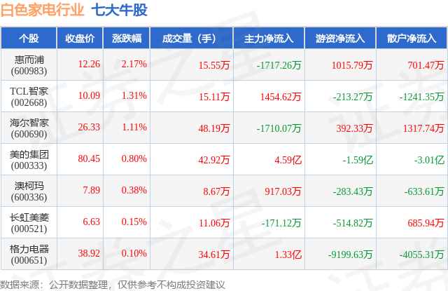 个股表现方面,白色家电行业当日领涨股为惠而浦(600983),该股当日报收12.26,上涨2.17%,成交量15.55万,主力资金净流出1717.26万元。TCL智家(002668)以上涨1.31%紧随其后,该股当日成交量15.11万,主力资金净流入1454.62万元。除此之外,海尔智家(600690)、美的集团(000333)、澳柯玛(600336)均进入当日牛股之列。具体个股列表见下表: