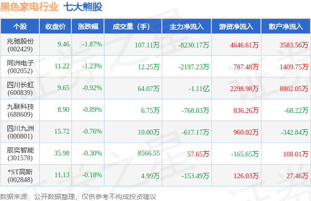 个股表现方面,黑色家电行业当日领跌股为兆驰股份(002429),该股当日报收9.46,下跌1.87%,成交量107.11万,主力资金净流出8230.17万元。同洲电子(002052)以下跌1.23%紧随其后,该股当日成交量12.25万,主力资金净流出2197.23万元。除此之外,四川长虹(600839)、九联科技(688609)、四川九洲(000801)均进入当日熊股之列。具体个股列表见下表: