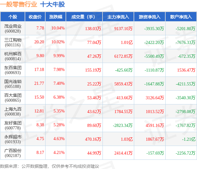 个股表现方面,一般零售行业当日领涨股为茂业商业(600828),该股当日报收7.78,上涨10.04%,成交量138.03万,主力资金净流入9137.1万元。三江购物(601116)以上涨10.02%紧随其后,该股当日成交量77.04万,主力资金净流入1.01亿元。除此之外,杭州解百(600814)、东百集团(600693)、国光连锁(605188)均进入当日牛股之列。具体个股列表见下表: