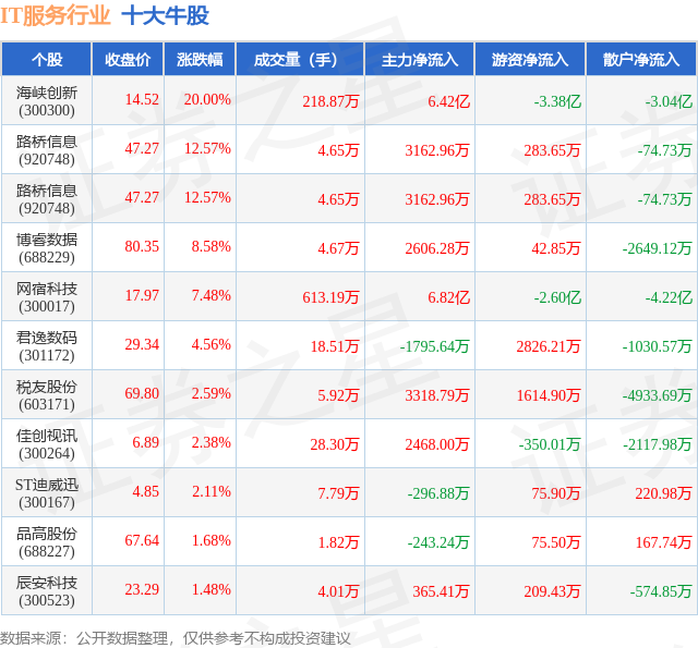 个股表现方面,IT服务行业当日领涨股为海峡创新(300300),该股当日报收14.52,上涨20.0%,成交量218.87万,主力资金净流入6.42亿元。路桥信息(920748)以上涨12.57%紧随其后,该股当日成交量4.65万,主力资金净流入3162.96万元。除此之外,路桥信息(920748)、博睿数据(688229)、网宿科技(300017)均进入当日牛股之列。具体个股列表见下表: