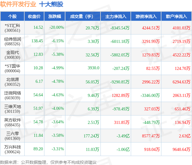 个股表现方面,软件开发行业当日领跌股为*ST汇科(300561),该股当日报收14.52,下跌20.0%,成交量20.76万,主力资金净流出8345.54万元。经纬恒润(688326)以下跌6.15%紧随其后,该股当日成交量3.3万,主力资金净流出6011.18万元。除此之外,金现代(300830)、*ST国华(000004)、北信源(300352)均进入当日熊股之列。具体个股列表见下表:
