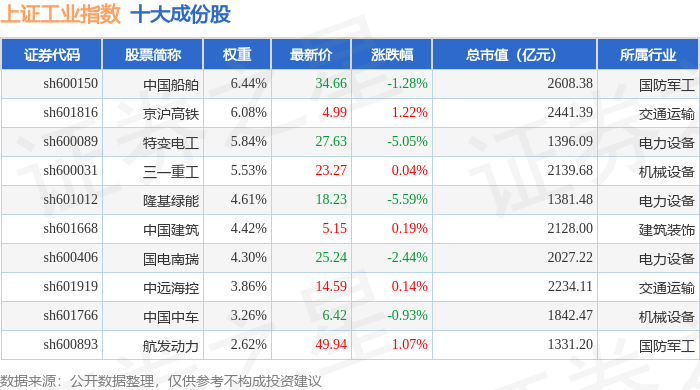上证工业(000034)指数十大成份股详情如下: