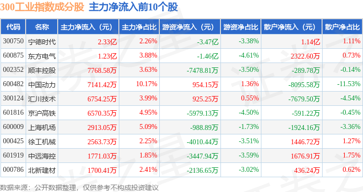 资金流向方面,300工业(000910)指数成份股当日主力资金净流出合计67.32亿元,游资资金净流入合计12.27亿元,散户资金净流入合计55.05亿元。成份股资金流向详情见下表: