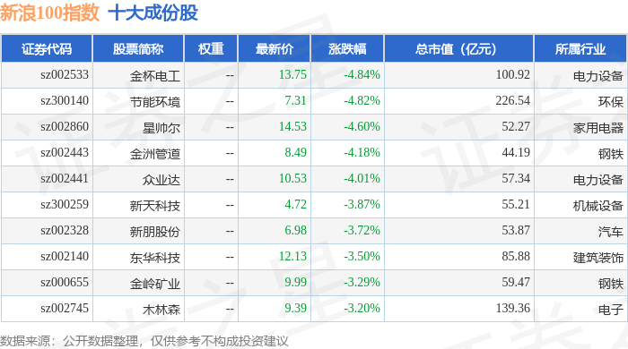 新浪100(399297)指数十大成份股详情如下: