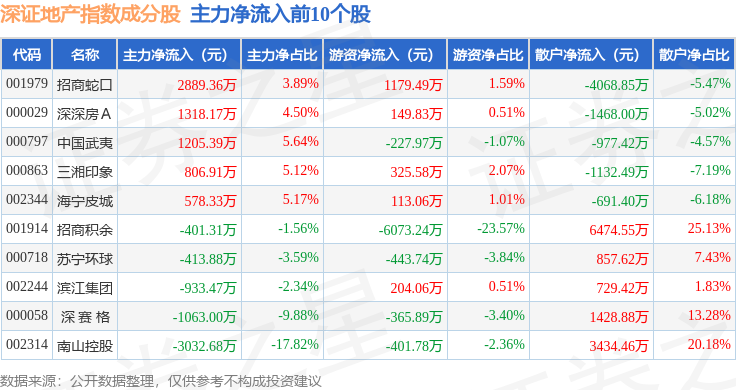 资金流向方面,深证地产(399637)指数成份股当日主力资金净流出合计4.0亿元,游资资金净流出合计1898.87万元,散户资金净流入合计4.19亿元。成份股资金流向详情见下表:
