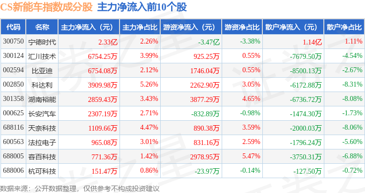 资金流向方面,CS新能车(399976)指数成份股当日主力资金净流出合计47.82亿元,游资资金净流入合计13.15亿元,散户资金净流入合计34.45亿元。成份股资金流向详情见下表: