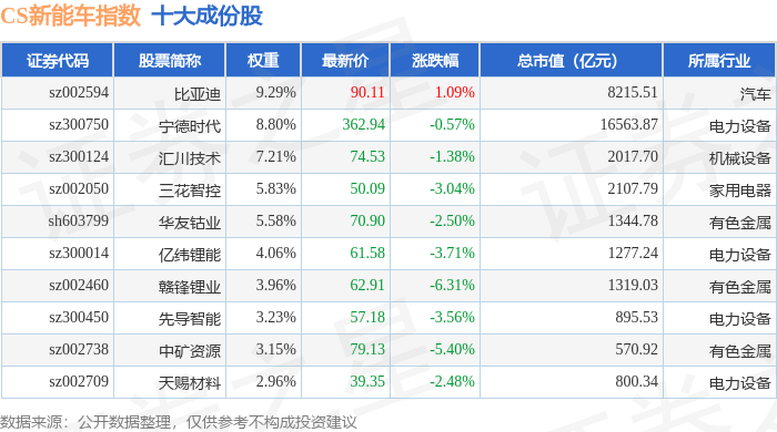 CS新能车(399976)指数十大成份股详情如下: