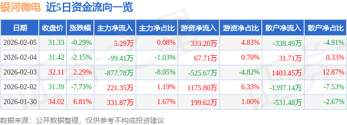 证券之星消息,截至2026年2月5日收盘,银河微电(688689)报收于31.33元,下跌0.29%,换手率1.72%,成交量2.22万手,成交额6898.16万元。