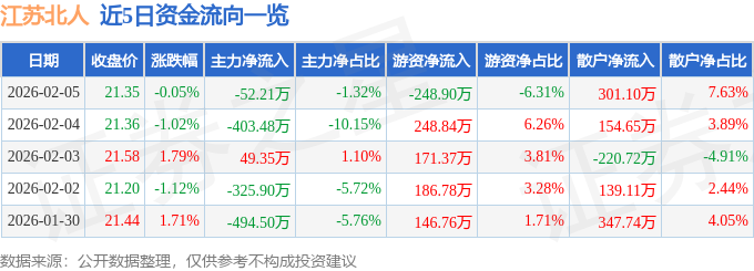 证券之星消息,截至2026年2月5日收盘,江苏北人(688218)报收于21.35元,下跌0.05%,换手率1.55%,成交量1.84万手,成交额3945.82万元。