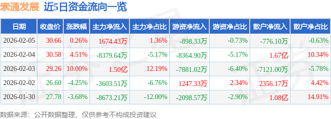 证券之星消息,截至2026年2月5日收盘,索通发展(603612)报收于30.66元,上涨0.26%,换手率8.01%,成交量39.88万手,成交额12.34亿元。