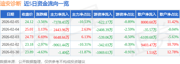 证券之星消息,截至2026年2月5日收盘,迪安诊断(300244)报收于24.12元,下跌3.56%,换手率5.78%,成交量28.99万手,成交额7.0亿元。