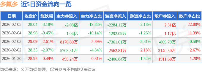 证券之星消息,截至2026年2月5日收盘,多氟多(002407)报收于28.04元,下跌3.18%,换手率3.44%,成交量37.17万手,成交额10.49亿元。