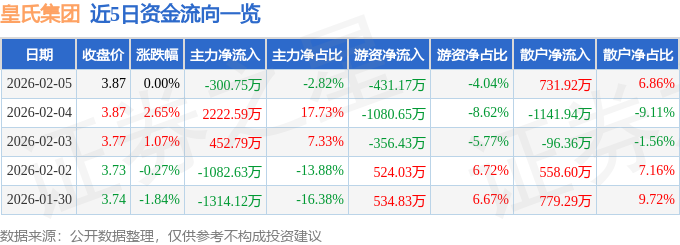 证券之星消息,截至2026年2月5日收盘,皇氏集团(002329)报收于3.87元,上涨0.0%,换手率4.22%,成交量27.46万手,成交额1.07亿元。