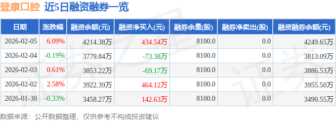 证券之星消息,截至2026年2月5日收盘,登康口腔(001328)报收于43.55元,上涨6.09%,换手率8.46%,成交量3.64万手,成交额1.57亿元。
