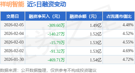 证券之星消息,2月5日,祥明智能(301226)融资买入601.91万元,融资偿还911.51万元,融资净卖出309.6万元,融资余额1.49亿元。